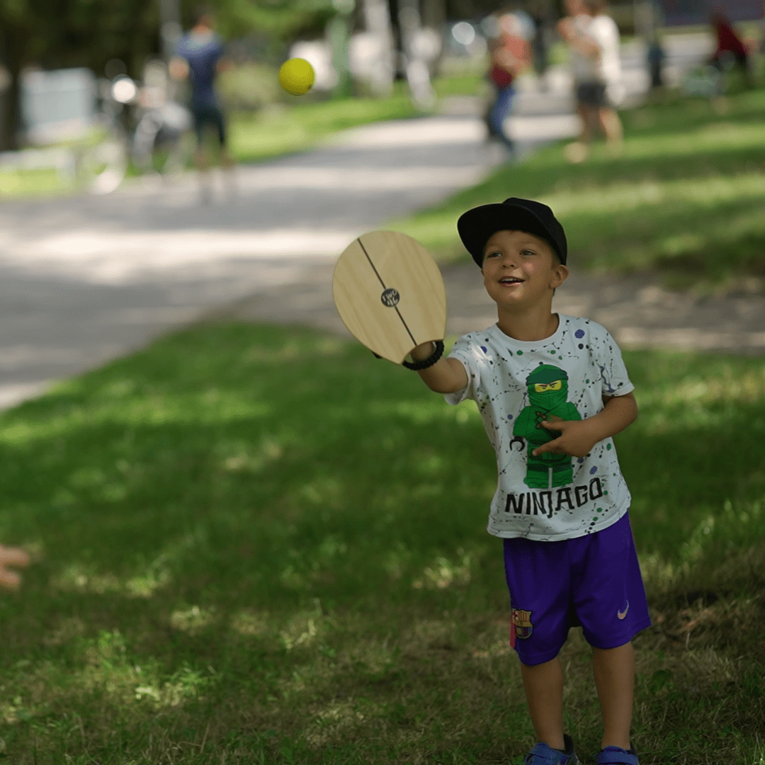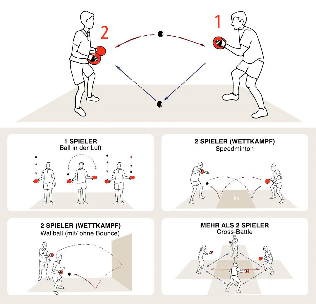 fördert. Es wird mit zwei grifflosen Schlägern und einem Ball gespielt. Es gibt kein fest definiertes Ziel desSpiels. Es kann sowohl zusammen, als auch gegeneinander, in Teams oder auch einfach nur alleine gespielt werden. Man kann sich eine Wand suchen und abwechselnd dagegen schlagen, ganz klassisch über ein Netz oder einfach nur hin und her spielen um den Ball in der Luft zu halten.